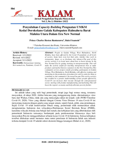 Prince, Charles Heston Runtunuwu and Bakri, Soamole (2022) Penyuluhan capacity building penguatan UMKM Kedai Dorokolano Galala Kabupaten Halmahera Barat Maluku Utara dalam era new normal. Jurnal Pengabdian Kepada Masyarakat Kalam, 1 (3): 10. pp. 194-206. ISSN 2829-8241