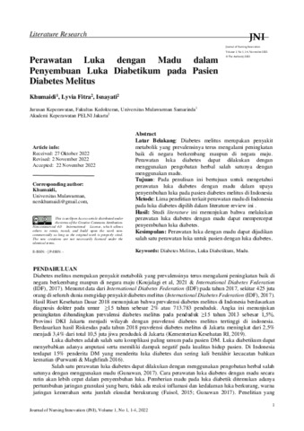 Khumaidi, Khumaidi and Lyvia, Fitra and Isnayati, Isnayati (2022) Perawatan luka dengan madu dalam penyembuhan luka diabetikum pada pasien Diabetes Melitus. Journal of Nursing Innovation, 1 (1): 1. pp. 1-4. ISSN 2962-8946