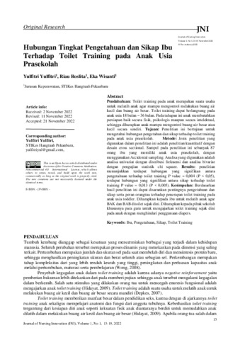 Yulfitri, Yulfitri and Riau, Roslita and Eka, Wisanti (2022) Hubungan tingkat pengetahuan dan sikap ibu terhadap toilet training pada anak usia prasekolah. Journal of Nursing Innovation, 1 (1): 3. pp. 13-19. ISSN 2962-8946