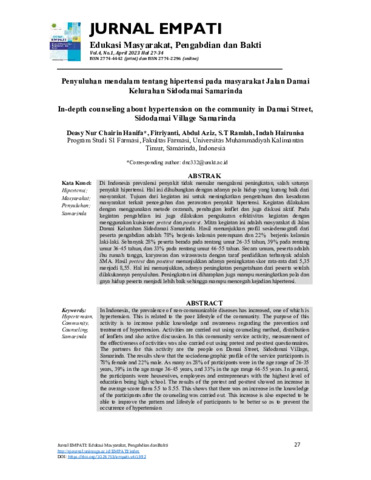 Deasy, Nur Chairin Hanifa and Fitriyanti, Fitriyanti and Abdul, Aziz and S.T, Ramlah and Indah, Hairunisa (2023) Penyuluhan mendalam tentang hipertensi pada masyarakat Jalan Damai Kelurahan Sidodamai Samarinda. Jurnal EMPATI: Edukasi Masyarakat, Pengabdian dan Bakti, 4 (1): 4. pp. 27-34. ISSN 2774-4442
