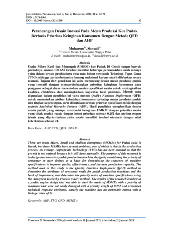Muharom, Siswadi and Siswadi, Siswadi (2020) Perancangan desain inovasi pada mesin produksi kue pudak berbasis prioritas keinginan konsumen dengan metode QFD dan AHP. Jurnal Mesin Nusantara, 3 (2): 2. pp. 62-71. ISSN 2775-7390