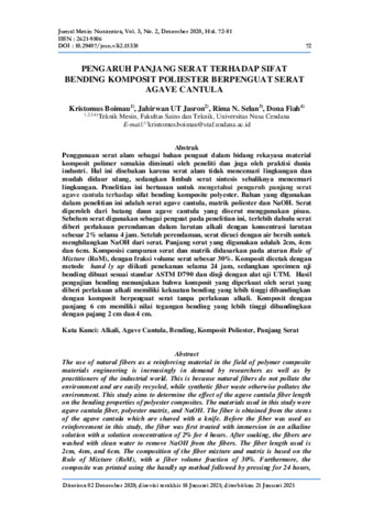 Kristomus, Boimau and Jahirwan, UT Jasron and Rima, N. Selan and Dona, Fiah (2020) Pengaruh panjang serat terhadap sifat bending komposit poliester berpenguat serat agave cantula. Jurnal Mesin Nusantara, 3 (2): 3. pp. 72-81. ISSN 2775-7390