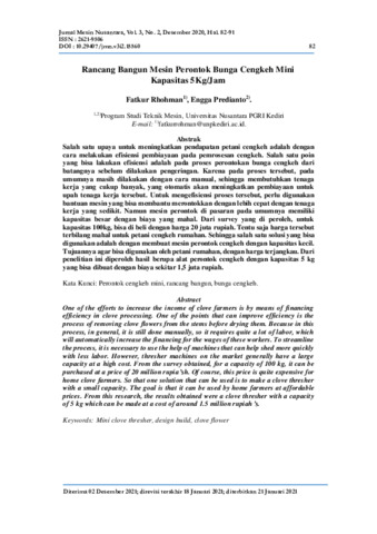 Fatkur, Rhohman and Engga, Predianto (2020) Rancang bangun mesin perontok bunga cengkeh mini kapasitas 5 kg/jam. Jurnal Mesin Nusantara, 3 (2): 4. pp. 82-91. ISSN 2775-7390