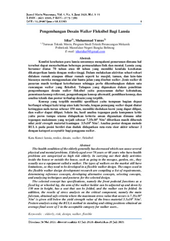 Idiar, Idiar and Muhammad, Yunus (2021) Pengembangan desain walker fleksibel bagi lansia. Jurnal Mesin Nusantara, 4 (1): 1. pp. 1-10. ISSN 2775-7390