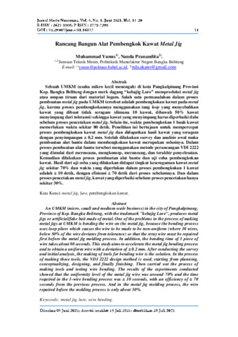 Sebuah UMKM (usaha mikro kecil menengah) di kota Pangkalpinang Provinsi Kep. Bangka Belitung dengan merk dagang “kebajig Lure” memproduksi metal jig atau umpan tiruan dari material logam. Salah satu permasalahan dalam proses pembuatan metal jig pada UMKM tersebut adalah pembengkokan kawat pada metal jig, karena proses pembengkokannya menggunakan tang loop yang menyebabkan kawat yang dibuat tidak seragam (dimana 10 kawat, dibawah 50% kawat menyimpang dari toleransi) sehingga kawat yang menyimpang harus diperbaiki dulu sebelum proses pencetakan metal jig. Selain itu, waktu pembengkokan 1 buah kawat memerlukan waktu sekitar 80 detik. Penelitian ini bertujuan untuk mempercepat proses pembengkokan kawat metal jig dan didapatkan hasil kawat yang seragam dengan penyimpangan ± 0,2 mm. Setelah dilakukan survey dan analisis awal maka pembuatan alat bantu dalam membengkokan kawat merupakan solusinya. Dalam proses pembuatan alat bantu tersebut menggunakan metode perancangan VDI 2222 yang dimulai dari merencana, mengkonsep, merancang, dan terakhir penyelesaian. Kemudian dilakukan proses pembuatan alat bantu dan uji coba pembengkokan kawat. Hasil dari uji coba yang dilakukan didapat tingkat keseragaman kawat metal jig sekitar 70% dan waktu yang diperlukan dalam proses pembengkokan 1 kawat adalah ± 10 detik, dengan efisiensi ± 70 detik dari proses sebelumnya. Dan dalam proses pencetakan metal jig, kawat yang diperbaiki sebelum proses pencetakan hanya sekitar 30%.
