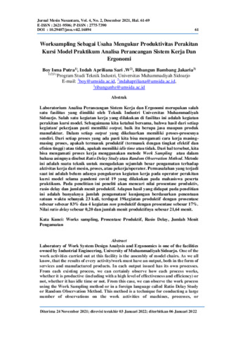 Boy, Isma Putra and Indah, Apriliana Sari .W and Ribangun, Bambang Jakaria (2021) Worksampling sebagai usaha mengukur produktivitas perakitan kursi model praktikum analisa perancangan sistem kerja dan ergonomi. Jurnal Mesin Nusantara, 4 (2): 2. pp. 61-69. ISSN 2775-7390