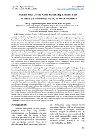 Siregar, Deasy Arryannur and Chalil, Diana and Sukiyono, Ketut (2023) Dampak virus Corona (Covid-19) terhadap konsumsi buah. Agro Bali : Agricultural Journal, 6 (1): 20. pp. 201-210. ISSN 2655-853X