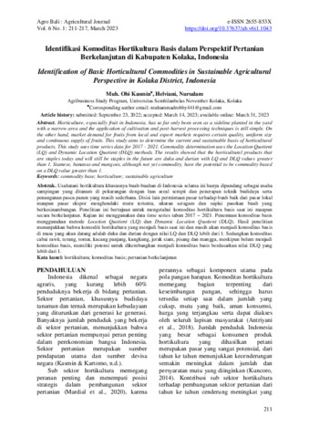 Kasmin, Muh. Obi and Helviani, Helviani and Nursalam, Nursalam (2023) Identifikasi komoditas hortikultura basis dalam perspektif pertanian berkelanjutan di Kabupaten Kolaka, Indonesia. Agro Bali : Agricultural Journal, 6 (1): 21. pp. 211-217. ISSN 2655-853X