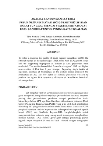 Tirta, Kumala Dewi and Sarjiya, Antonius and Hartati, Imamudin (2011) Analisa kandungan IAA pada pupuk organik hayati (POH)-STARTMIK LIPI dan isolat tunggal sebagai starter serta isolat baru kandidat untuk peningkatan kualitas. Technical Report. Bidang Mikrobiologi, Pusat Penelitian Biologi, Cibinong. (Unpublished)