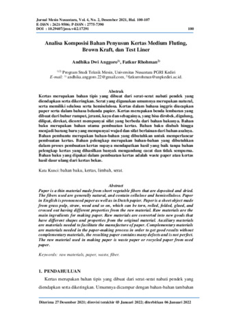 Andhika, Dwi Anggoro and Fatkur, Rhohman (2021) Analisa komposisi bahan penyusun kertas medium fluting, brown kraft, dan test liner. Jurnal Mesin Nusantara, 4 (2): 7. pp. 100-107. ISSN 2775-7390