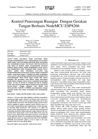 Wungkana, Tony J. and Sajangbati, Nikita and Pairunan, Toban T. and Loegimin, Benny A.P. and Sawidin, Sukandar (2023) Kontrol penerangan ruangan dengan gerakan tangan berbasis NodeMCU ESP8266. Jambura Journal of Electrical and Electronics Engineering, 5 (1): 4. pp. 18-22. ISSN 2654-7813