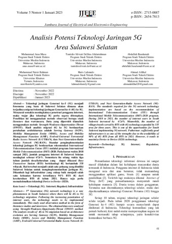 Muhammad, Anas Masa and Tanridio, Silviati Delfina Abdurrahman and Abdullah, Basalamah and Muhammad, Natsir Rahman and Haris, Lahmado and Ahmad, Afdhal (2023) Analisis potensi teknologi jaringan 5G area Sulawesi Selatan. Jambura Journal of Electrical and Electronics Engineering, 5 (1): 8. pp. 41-47. ISSN 2654-7813