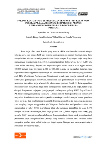 Syaiful, Bahri and Oktaviani, Nurmalasary (2022) Faktor-faktor yang berhubungan dengan stres kerja pada pekerja PT. Jaya Semanggi Enjiniring di proyek pembangunan gedung RSUD Bogor Utara tahun 2021. Journal of Health Research Science, 2 (2): 1. pp. 57-66. ISSN 2798-7442