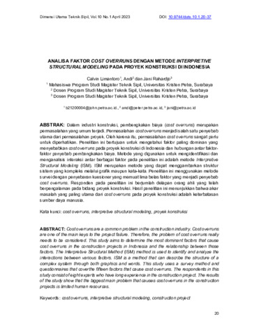 Calvin, Limantoro and Andi, Andi and Jani, Rahardjo (2023) Analisa faktor cost overruns dengan metode interpretive structural modeling pada proyek konstruksi di Indonesia. Dimensi Utama Teknik Sipil, 10 (1): 2. pp. 20-37. ISSN 2656-3312
