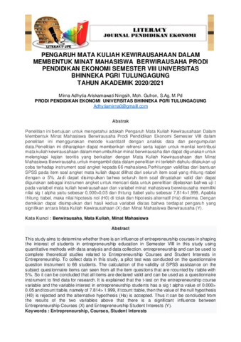 Penelitian ini bertujuan untuk mengetahui adakah Pengaruh Mata Kuliah Kewirausahaan Dalam Membentuk Minat Mahasiswa Berwirausaha Prodi Pendidikan Ekonomi Semester VIII dalam penelitian ini menggunakan metode kuantitatif dengan analisis data dan pengumpulan data.Penelitian ini diharapkan dapat memberikan refrensi serta kajian untuk menilai kontribusi mata kuliah kewirausahaan dalam menumbuhkan minat berwirausaha dan dapat digunakan untuk melengkapi kajian teoritis yang berkaitan dengan Mata Kuliah Kewirausahaan dan Minat Mahasiswa Berwirausaha.untuk mengambil data dalam penelitian ini terlebih dahulu dilakukan uji coba terhadap instrument soal angket kepada 66 mahasiswa.Perhitungan validitas dari bantuan SPSS pada item soal angket mata kuliah dapat dilihat dari seluruh item soal yang rhitung rtabel dengan α 5%. Jadi dapat disimpulkan bahwa seluruh item soal dinyatakan valid dan dapat digunakan sebagai instrumen angket untuk mencari data untuk penelitian dijelaskan bahwa uji t pada variabel mata kuliah kewirausahaan dan variabel minat mahasiswa berwirausaha memiliki nilai sig t alpha yaitu sebesar 0,000>0,05 dan thitung ttabel yaitu sebesar 7,814>1,999, Apabila thitung ttabel, maka nilai hipotesis nol (H0) di tolak dan hipotesis alternatif (Ha) diterima. Dengan demikian dapat disimpulkan dari hasil kedua variabel diatas bahwa terdapat pengaruh yang signifikan antara Mata Kuliah Kewirausahaan (X) dan Minat Mahasiswa Berwirausaha (Y).