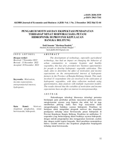 Dedi, Susanto and Martinus, Buulolo (2022) Pengaruh motivasi dan ekspektasi pendapatan terhadap minat berwirausaha petani hidroponik di Provinsi Kepulauan Bangka Belitung. AKDBB Journal of Economics and Business (AJEB), 1 (2): 3. pp. 32-44. ISSN 2963-7341