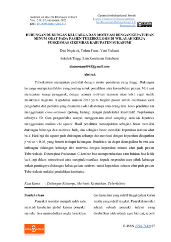 Dini, Nopianti and Yohan, Frans and Yeni, Yulianti (2022) Hubungan dukungan keluarga dan motivasi dengan kepatuhan minum obat pada pasien tuberkulosis di wilayah kerja Puskesmas cikembar kabupaten Sukabumi. Journal of Health Research Science, 2 (2): 2. pp. 67-75. ISSN 2798-7442