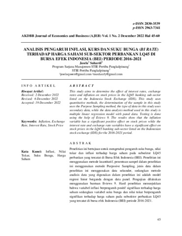 Jasela, Jasela and Suhardi, Suhardi (2022) Analisis pengaruh inflasi, kurs dan suku bunga (BI Rate) terhadap harga saham sub-sektor perbankan LQ45 di Bursa Efek Indonesia (BEI) periode 2016-2021. AKDBB Journal of Economics and Business (AJEB), 1 (2): 4. pp. 45-60. ISSN 2963-7341
