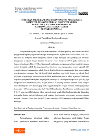 Siti, Rohmah and Yana, Hendriana and Mutia, Agustiani Moonti (2022) Hubungan jarak pandang dan intensitas penggunaan Komputer dengan kejadian computer vision syndrome (cvs) pada mahasiswa s1 keperawatan tingkat akhir Di stikes kuningan. Journal of Health Research Science, 2 (2): 4. pp. 84-92. ISSN 2798-7442
