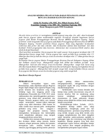 Aletha, M. Nenabu and Mikael, Jeramu and Fransiskus, Ganggas and Stanislaus, Ngawang (2022) Analisis kinerja pegawai pada badan penanggulangan bencana daerah Kabupaten Kupang. Equilibrium: Jurnal Akuntansi dan Manajemen, 10: 2. pp. 10-16. ISSN 2620-3790
