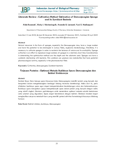 Aida, Rozanah and Rizky, I Febrianingsih and Ananda, O Larasati and Yuni, E Hadisaputri (2023) Tinjauan pustaka : Optimasi metode budidaya Spons Demospongiae dan bakteri simbionnya. IJBP: Indonesian Journal of Biological Pharmacy, 3 (1): 4. pp. 33-41. ISSN 2807-5277