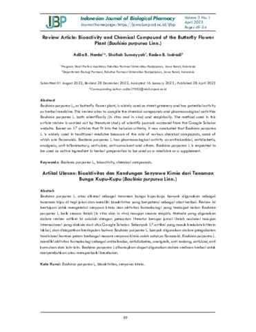 Adila, R Harda and Shofiah, Sumayyah and Raden, B Indradi (2023) Artikel ulasan: Bioaktivitas dan kandungan senyawa kimia dari tanaman bunga kupu-kupu (Bauhinia purpurea Linn.). IJBP: Indonesian Journal of Biological Pharmacy, 3 (1): 6. pp. 49-54. ISSN 2807-5277
