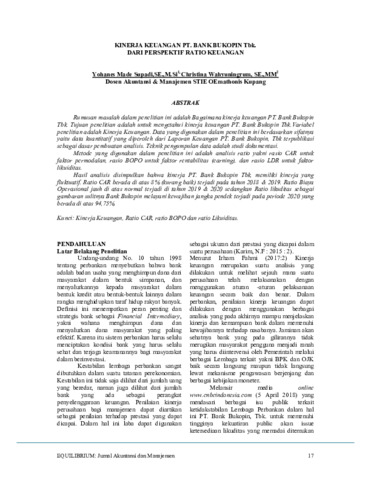 penelitian adalah Kinerja Keuangan.Data yang digunakan dalam penelitian ini berdasarkan sifatnya yaitu data kuantitatif yang diperoleh dari Laporan Keuangan PT.Bank Bukopin, Tbk terpublikasi sebagai dasar pembuatan analisis.Teknik pengumpulan data adalah studi dokumentasi. Metode yang digunakan dalam penelitian ini adalah analisis rasio yaitu rasio CAR untuk faktor permodalan, rasio BOPO terhadap faktor rentabilitas (earning), dan rasio LDR terhadap faktor likuiditas. Hasil analisis disimpulkan bahwa kinerja PT.Bank Bukopin Tbk, memiliki kinerja yang fluktuatif Rasio CAR berada di atas 8% (kurang baik) terjadi pada tahun 2018 & 2019. Rasio Biaya Operasional jauh di atas normal terjadi di tahun 2019 & 2020 sedangkan Ratio likuditas sebagai gambaran sulitnya Bank Bukopin melayani kewajiban jangka pendek yang terjadi pada periode 2020 yang berada di atas 94,75%.