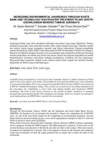 M., Hasan Abdullah and Subaderi, Subaderi and Fitriya, Gemala Dewi (2022) Increasing environmental awareness through waste bank and technology wastewater treatment plant (WWTP) Osowilangon Benowo Tambak Surabaya. Jurnal Pengabdian Masyarakat dan Inovasi Teknologi, 1 (2): 3. pp. 40-46. ISSN 2828-5581