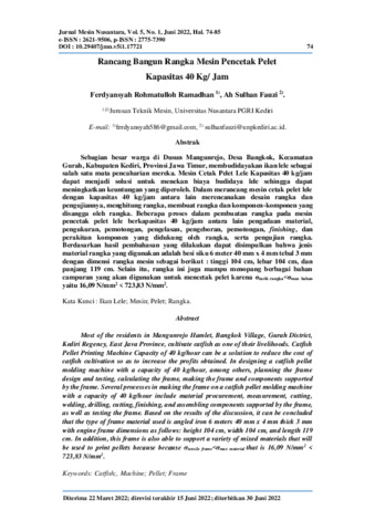 Ferdyansyah, Rohmatulloh Ramadhan and Ah., Sulhan Fauzi (2022) Rancang bangun rangka mesin pencetak pelet kapasitas 40 kg/ jam. Jurnal Mesin Nusantara, 5 (1): 8. pp. 74-85. ISSN 2775-790