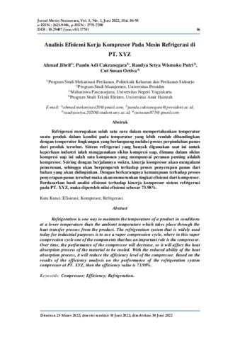 Ahmad, Jibril and Pandu, Adi Cakranegara and Raudya, Setya Wismoko Putri and Cut, Susan Octiva (2022) Analisis efisiensi kerja kompresor pada mesin refrigerasi di PT. XYZ. Jurnal Mesin Nusantara, 5 (1): 9. pp. 86-95. ISSN 2775-7390