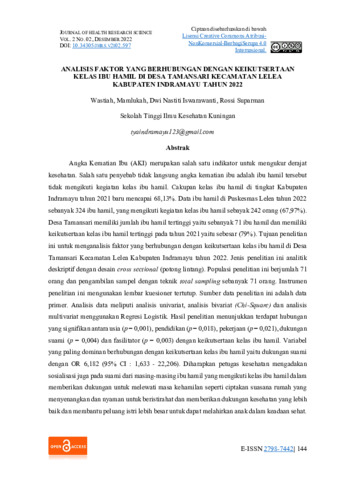 Wastiah, Wastiah and Mamlukah, Mamlukah and Dwi, Nastiti Iswarawanti and Rossi, Suparman (2022) Analisis faktor yang berhubungan dengan keikutsertaan Kelas ibu hamil di desa tamansari kecamatan lelea Kabupaten indramayu tahun 2022. Journal of Health Research Science, 2 (2): 10. pp. 144-154. ISSN 2798-7442