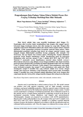 Ilham, Nugrahatama Putra and Iman, Saefuloh and Bintang, Adjiantoro and Miftahul, Jannah (2022) Pengembangan baja paduan tahan peluru melalui proses hot-forging terhadap morfologi dan sifat mekanik. Jurnal Mesin Nusantara, 5 (1): 12. pp. 119-128. ISSN 2775-7390