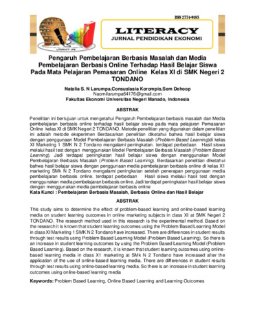 Natalia, S. N Larumpa and Consuslasia, Korompis and Sem, Dehoop (2020) Pengaruh pembelajaran berbasis masalah dan media pembelajaran berbasis online terhadap hasil belajar siswa pada mata pelajaran pemasaran online kelas XI di SMK Negeri 2 Tondano. Literacy: Jurnal Pendidikan Ekonomi, 1 (2): 14. pp. 101-116. ISSN 2774-9185