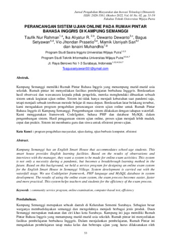 Taufik, Nur Rahman and Ika, Aliyatur R and Dewanto, Dewanto and Bagus, Setyawan (2022) Perancangan sistem ujian online pada Rumah Pintar Bahasa Inggris di Kampung Semanggi. Jurnal Pengabdian Masyarakat dan Inovasi Teknologi, 1 (2): 5. pp. 53-59. ISSN 2828-5581