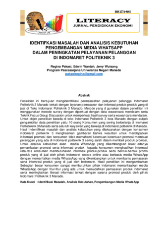 Regina, Pakasi and Edwin, Wantah and Jerry, Wuisang (2021) Identifikasi masalah dan analisis kebutuhan pengembangan media whatsapp dalam peningkatan pelayanan pelanggan di Indomaret Politeknik 3. Literacy: Jurnal Pendidikan Ekonomi, 2 (2). pp. 1-7. ISSN 2774-9185