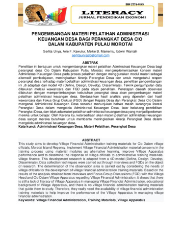 Serlita, Unya and Meike B., Mamentu and Arie F., Kawulur and Edwin, Wantah (2021) Pengembangan materi pelatihan administrasi keuangan desa bagi perangkat desa Cio dalam Kabupaten Pulau Morotai. Literacy: Jurnal Pendidikan Ekonomi, 2 (2). pp. 1-12. ISSN 2774-9185
