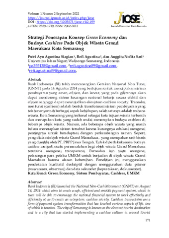 Putri, Ayu Agustina Siagian and Refi, Agustina and Anggita, Nofita Sari (2022) Strategi penerapan konsep green economy dan budaya cashless pada objek wisata Grand Maerakaca Kota Semarang. Journal of Indonesian Sharia Economics, 1 (2): 4. pp. 171-188. ISSN 2962-3812