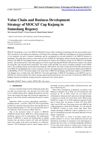 Mira, Ismiyanti Pribadi and Wawan, Gunawan and Rijanti Rahaju, Maulani (2022) Value chain and business development Strategy of mocaf cap kujang in Sumedang regency. 3BIO: Journal of Biological Science, Technology and Management, 4 (2): 1. pp. 61-71. ISSN 2655-8777