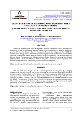 Esti, Handayani and Siti, Mahmudah and Muhamad, Asari (2021) Usaha naik kelas dengan mewujudkan kemasan, aspek legalitas, dan promosi digital. Jurnal Manajemen Kewirausahaan, 18 (2): 3. pp. 117-124. ISSN 1858-1048