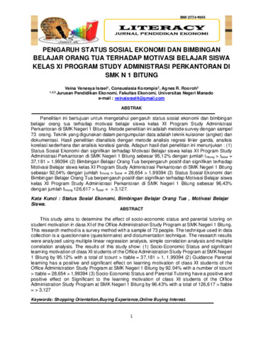 Veina, Venesya Israel and Consuslasia, Korompis and Agnes, R. Rooroh (2021) Pengaruh status sosial ekonomi dan bimbingan belajar orang tua terhadap motivasi belajar siswa kelas XI Program Studi Administrasi Perkantoran di SMK N 1 Bitung. Literacy: Jurnal Pendidikan Ekonomi, 2 (2). pp. 1-11. ISSN 2774-9185