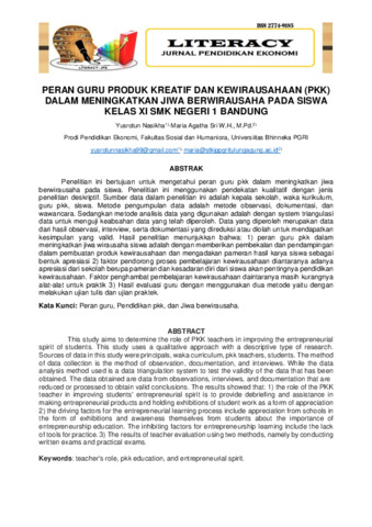 Yusrotun, Nasikha and Maria, Agatha Sri W.H (2021) Peran guru Produk Kreatif dan Kewirausahaan (PKK) dalam meningkatkan jiwa berwirausaha pada siswa kelas XI SMK Negeri 1 Bandung. Literacy: Jurnal Pendidikan Ekonomi, 2 (2): 8. pp. 70-77. ISSN 2774-9185