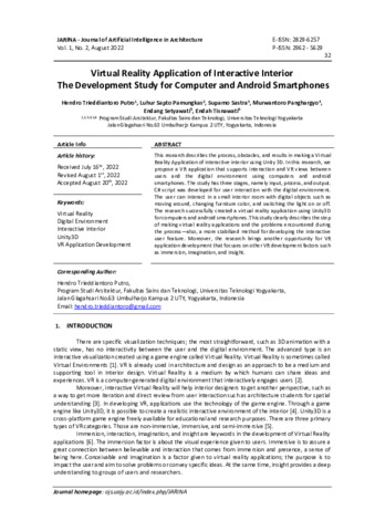 Hendro, Trieddiantoro Putro and Luhur, Sapto Pamungkas and Suparno, Sastra and Murwantoro, Panghargyo and Endang, Setyawati and Endah, Tisnawati (2022) Virtual reality application of interactive interior: The development study for computer and android smartphones. Journal of Artificial Intelligence in Architecture, 1 (2): 4. pp. 32-41. ISSN 2962-5629