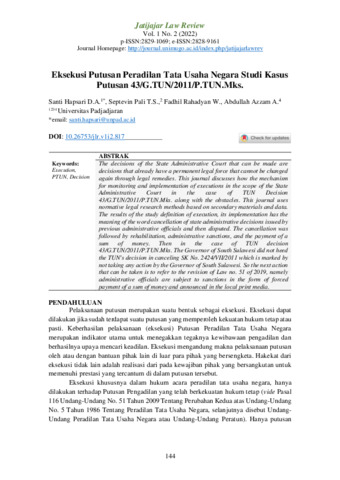 Santi, Hapsari D.A. and Septevin, Pali T.S. and Fadhil, Rahadyan W. and Abdullah, Azzam A. (2022) Eksekusi putusan peradilan tata usaha negara studi kasus putusan 43/G.TUN/2011/P.TUN.Mks. Jatijajar Law Review, 1 (2): 5. pp. 144-152. ISSN 2829-1069