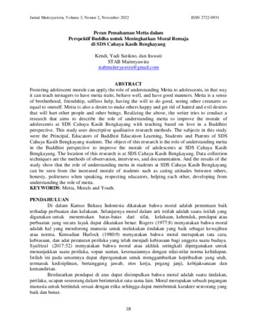 Kendi, Kendi and Yadi, Sutikno and Irawati, Irawati (2022) Peran pemahaman metta dalam perspektif Buddha untuk meningkatkan moral remaja di SDS Cahaya Kasih Bengkayang. Jurnal Maitreyawira, 3 (2): 3. pp. 18-24. ISSN 2722-0931