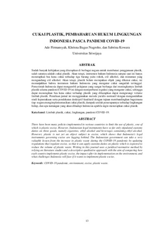 Ade, Firmansyah and Khrisna, Bagus Nugroho and Sabrina, Kowara (2023) Cukai plastik, pembaharuan hukum lingkungan Indonesia pasca pandemi Covid-19. ALSA Indonesia Law Journal, 5 (1): 2. pp. 13-36. ISSN 2656-5420
