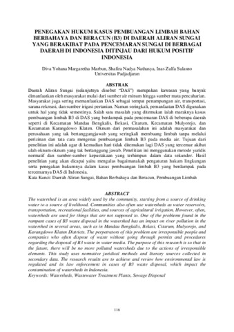 Diva Yohana Margaretha, Marbun and Shafira Nadya, Nathasya and Inas Zulfa, Sulasno (2023) Penegakan hukum kasus pembuangan limbah bahan berbahaya dan beracun (B3) di daerah aliran sungai yang berakibat pada pencemaran sungai di berbagai daerah di Indonesia ditinjau dari hukum positif Indonesia. ALSA Indonesia Law Journal, 5 (1): 7. pp. 116-135. ISSN 2656-5420