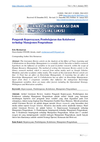 Eric, Hermawan (2023) Pengaruh kepercayaan, pembelajaran dan kolaborasi terhadap manajemen pengetahuan. Jurnal Komunikasi dan Ilmu Sosial, 1 (1): 3. pp. 26-37. ISSN 2963-0525