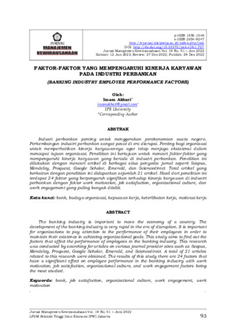 Imam, Akbari (2022) Faktor-faktor yang mempengaruhi kinerja karyawan pada industri perbankan. Jurnal Manajemen Kewirausahaan, 19 (1): 10. pp. 93-100. ISSN 1858-1048