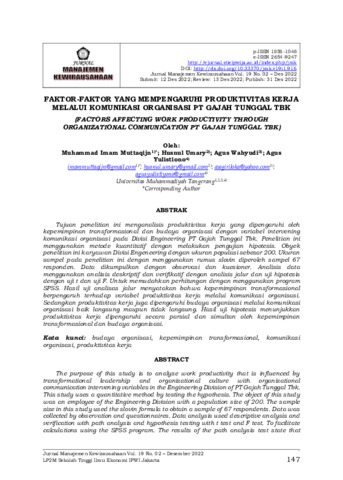 Muhammad, Imam Muttaqijn and Husnul, Umary and Agus, Wahyudi and Agus, Yulistiono (2022) Faktor-faktor yang mempengaruhi produktivitas kerja melalui komunikasi organisasi PT Gajah Tunggal TBK. Jurnal Manajemen Kewirausahaan, 19 (2): 5. pp. 147-154. ISSN 1858-1048