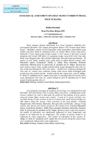 Hellen, Kurniati (2012) Ecological assessment of Limau Manis’s torrent frogs, West Sumatra. Limnotek : Perairan Darat Tropis di Indonesia, 19 (2): 2. pp. 113-125. ISSN 2549-8029